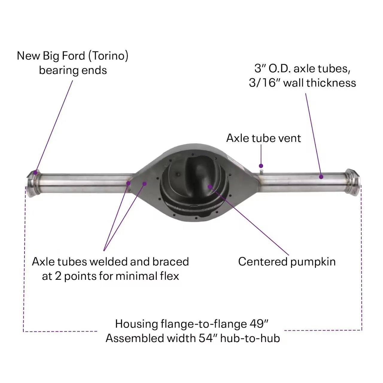 - Assembled rearend measures 54″ from hub-to-hub (axle flange face-to-face)