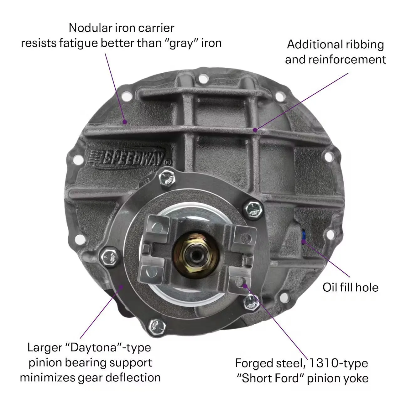 We have reinforced the rearmost pinion (pilot bearing) support and use a large “Daytona” nodular iron pinion bearing support with a spacer and shim assembly to maintain perfect pinion gear alignment and long life. The spacer/shim stack gives durability and ease of service. The larger oiling channels of the Daytona bearing support also add to long bearing life. We included a NEW, forged steel 1310-style “Short Ford” pinion yoke to round off this durable assembly.