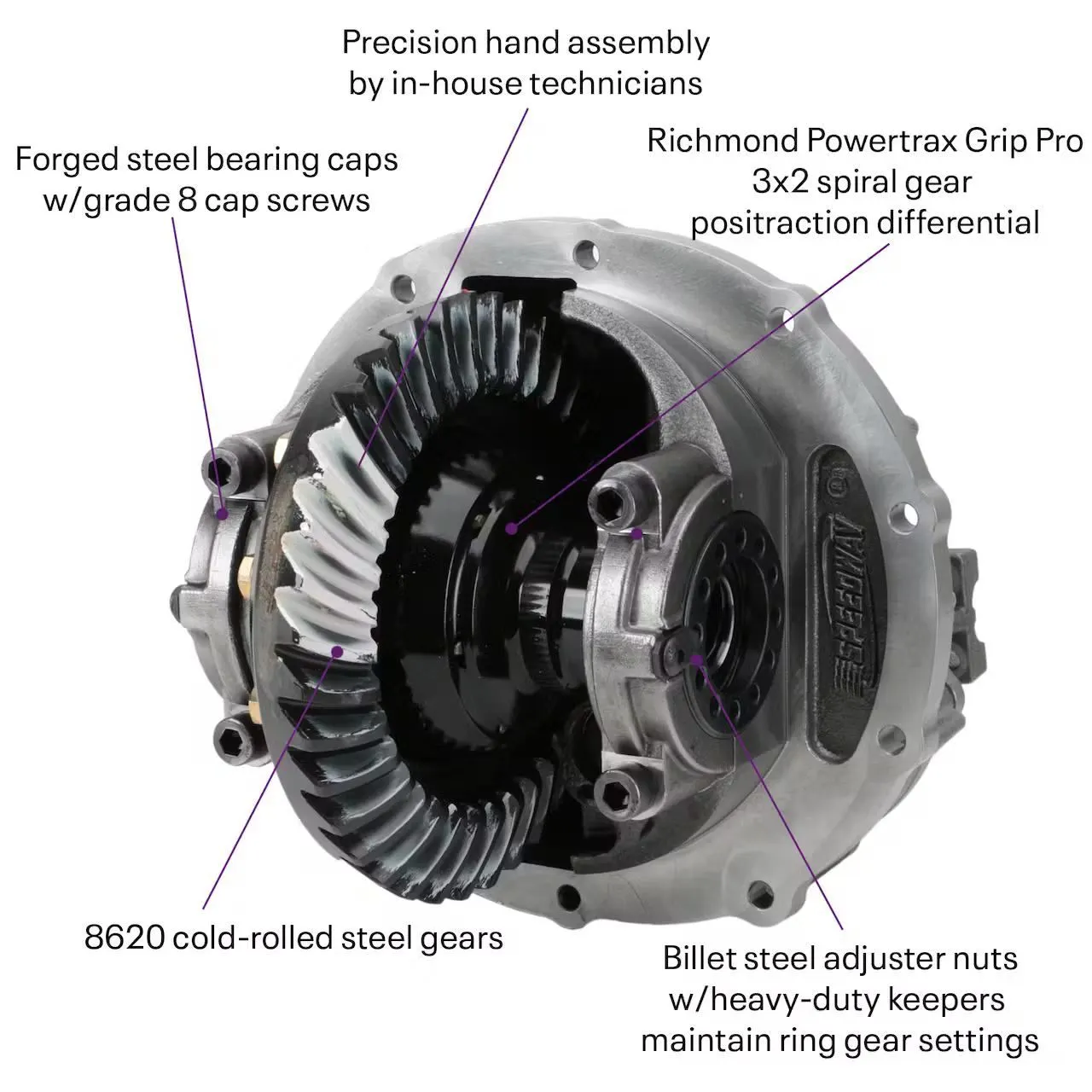 For the ultimate in putting power to the pavement, Richmond Powertrax Grip Pro Traction Systems are the latest design in traction using 3 x 2 spiral gear technology. These differentials provide smooth, dependable operation combining a limited-slip differential with the strength of a fully machined, forged steel case. Because there are no friction plates, no friction modifier additive is necessary. Always use a 80W-90 weight petroleum based gear oil with a GL-5 (or higher) rating, friction additive/modifiers should NOT BE USED. Synthetic oils and oils containing friction modifiers are not recommended.