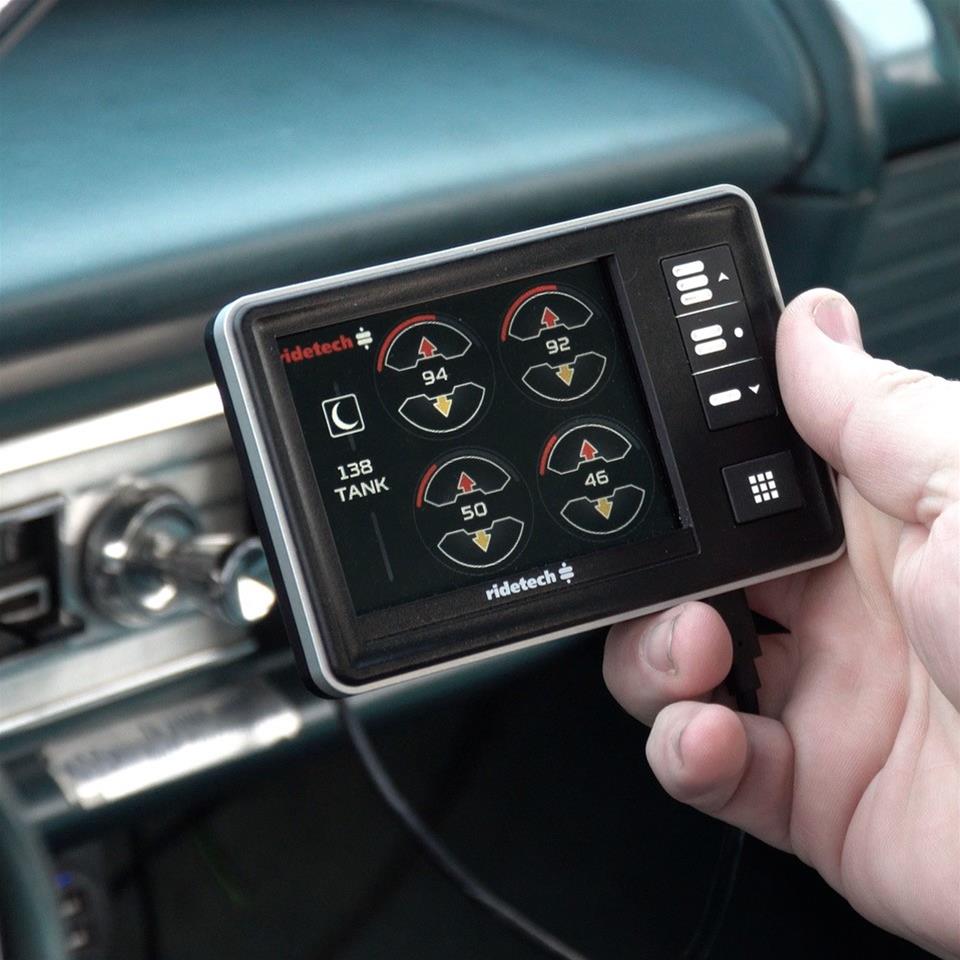 RideTech RidePro E5 Air Ride Control BigRed AirPod dual compressor systems offer all-in-one integrated, pre-wired solutions that mount in your vehicle as a single unit and adjust vehicle height at the push of a button while maintaining balanced air springs. With sophisticated pressure and height algorithms, RidePro E5 control systems tune air ride suspension for proper handling and world-class ride quality, so that each time your turn the ignition key, RidePro E5 self-adjusts to ride height and compensates for changes in load. They are ideal for trucks and other heavy applications to quickly raise and lower your vehicle and adjusting vehicle height is as simple as choosing one of three presets. You can also control the system wirelessly by simply connecting a compatible smartphone via Bluetooth and using the RidePro E5 app.